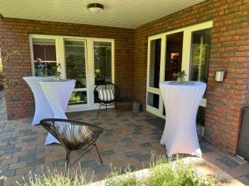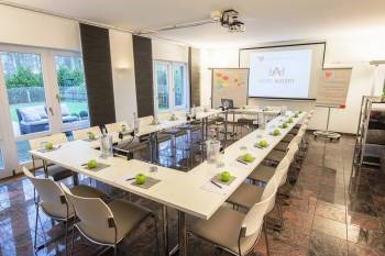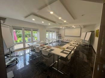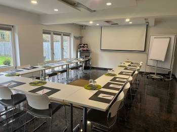 Der modern eingerichtete Tagungsraum mit viel Tageslicht und Aussicht ins Grüne für bis zu 20 Teilnehmer verfügt über umfangreiche Standardtechnik wie W-LAN, Beamer, elektrische Leinwand, Pinnwand, Flipchart und Moderationsmaterial. Auf Wunsch Steckdosenleiste für Laptop & Co. an den Tagungstischen. Die Tagungspausen genießen unsere Gäste auf der Sonnenterrasse oder im Tagungsfoyer. Der Garten bietet eine ideale Umgebung für Gruppenarbeiten im Freien.